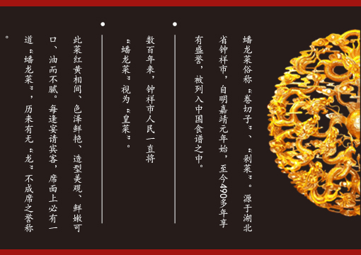 嚴(yán)選優(yōu)質(zhì)原料,歷史名菜,傳遞正宗鐘祥蟠龍菜!